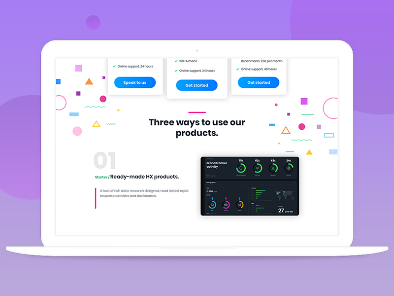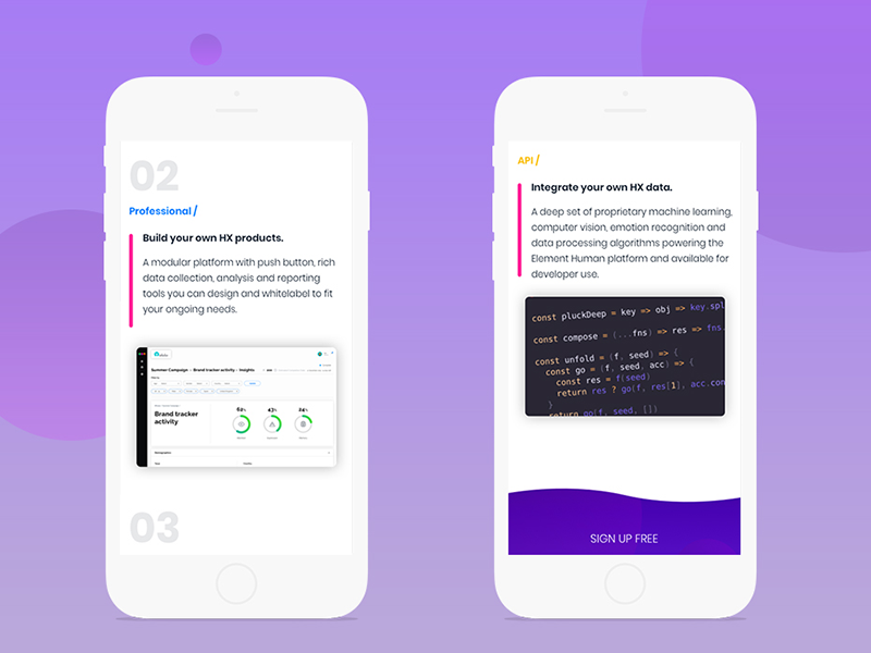 Element Human required a responsive website to showcase their product—a platform capturing emotion and behavior across digital experiences. The key focus was on developing a UX design to engage users, elucidate the platform's value, and convey its story clearly and effectively. After finalizing styles and visual approaches for the Homepage, I proceeded to design the Pricing page using Sketch and Zeplin. Prototypes were created in Marvel to visualize and finalize interactions before delivering the designs to our Webflow developer. In essence, the challenge lay in creating a visually appealing and user-friendly design for a typically complex industry—Research.